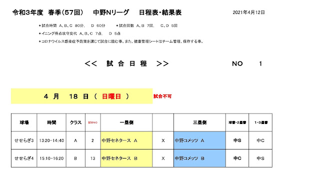 中野Nリーグ関係者 各位 2021/4/24